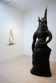 ברחבי הגלריה ניתן למצוא שלל אובייקטים מטופלים: חרבות וסכינים העשויים קרשים אסופיים ושבורים, כלים ושרשראות המורכבים מעצמות פרה, ענפים ועלים צבועים הנדמים כחפצי פולחן קטנים. אלו אובייקטים אשר שימושם לא ברור, ועם זאת הם משמרים בתוכם אנרגיה מוחשית של מלאכה אנושית קפדנית. התהליך הפרקטי והרוחני של הפולחן, של הפניה אל כוחות גדולים ונסתרים מאיתנו והאמונה ביכולותיהם להשפיע על המתרחש, מהדהדת את מעשיו של החומר האפל עצמו. כמו השחור משחור המכסה את שולי העולם באופן המאפשר לנו להתבונן רק במה שאנו מבינים, כך גם כל אותם חפצים נועדו לפייס, לרצות ולשכנע את מי שאחראים לגורלנו, ויכולים להרכיב עבורנו תמונת מציאות שנהיה מסוגלים להכיל.